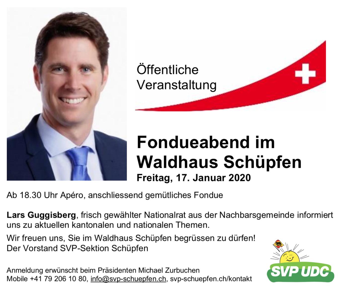 Anmeldungen sind beim Sektionspräsidenten Michael Zurbuchen unter 079 206 10 80 oder per Mail unter info@svp-schüpfen.ch erwünscht.