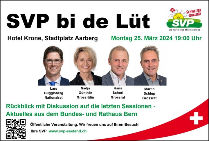 Veranstaltung mit Nationalrat Lars Guggisberg, Grossrätin Nadja Günthör, den Grossräten Martin Schlup und Hans Schori. Erhalten Sie aus erster Hand Informationen über die aktuellen politischen Geschehnisse auf nationaler und kantonaler Ebene. Nutzen Sie die Gelegenheit und stellen sie Ihre Fragen direkt an unsere Vertreterinnen und Vertreter. Wir freuen uns auf Sie!