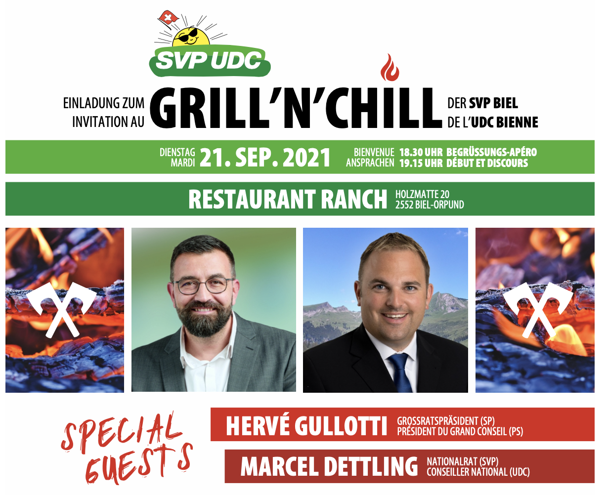 Die SVP Biel lädt Sie herzlich zum Grill ‘n’ Chill am Dienstag, 21. September 2021 ein.